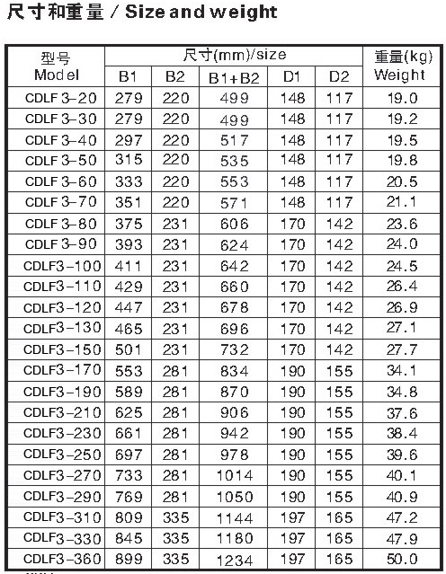 CDLF為安裝標(biāo)準(zhǔn)電機(jī)的非自吸立式多級(jí)離心泵,電機(jī)軸通過泵頭用聯(lián)軸器直接與泵軸聯(lián)接,拉桿螺栓將耐壓筒、過流部件固定在泵頭和進(jìn)出水段之間,泵進(jìn)出水口在泵底同一直線上;本泵可根據(jù)需要配置智能保護(hù)器,對(duì)泵干轉(zhuǎn)\缺相\過載等進(jìn)行有效保護(hù)。