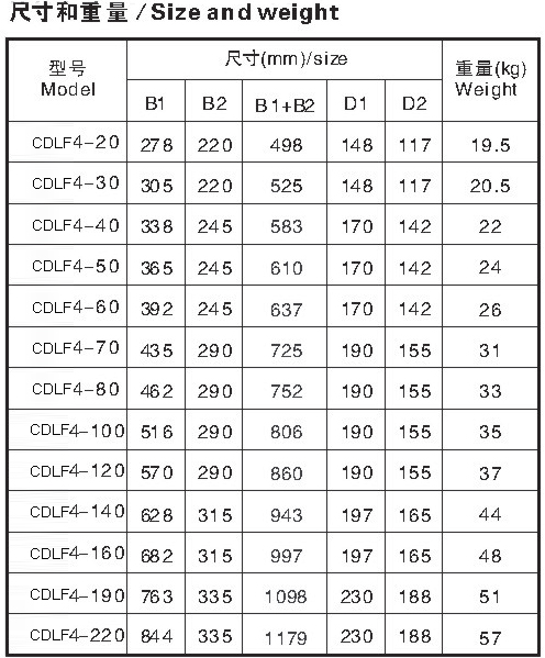 CDLF為安裝標準電機的非自吸立式多級離心泵,電機軸通過泵頭用聯(lián)軸器直接與泵軸聯(lián)接,拉桿螺栓將耐壓筒、過流部件固定在泵頭和進出水段之間,泵進出水口在泵底同一直線上;本泵可根據(jù)需要配置智能保護器,對泵干轉(zhuǎn)\缺相\過載等進行有效保護。